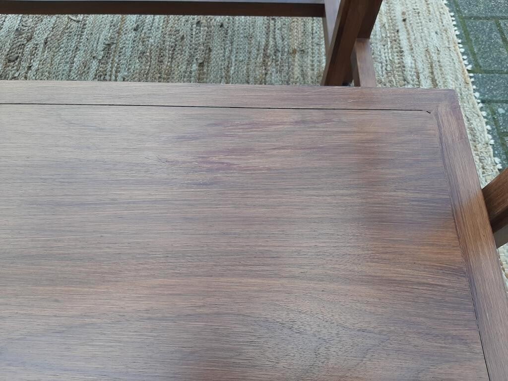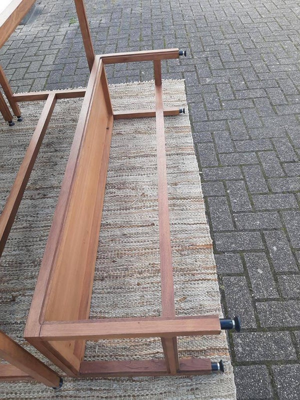 Zowel de tafel als de banken zijn van massief hout, met subtiel ingefreesde hoeken, voorzien van een goede coating en vier verstelbare voetjes.
