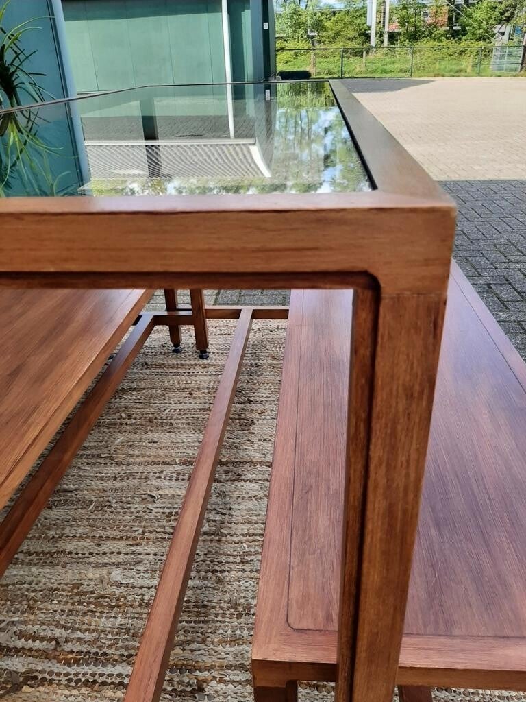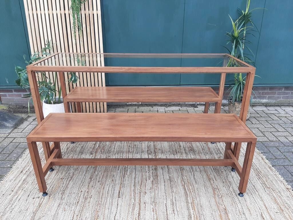 Mooie presentatietafel, complete set met twee banken.